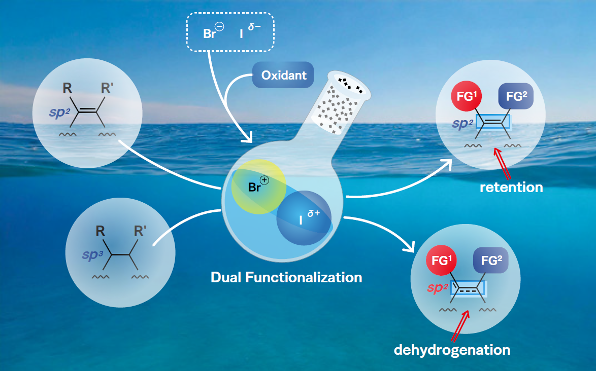 実は、有機化学の世界ではこれまでハロゲンはどちらかというと注目はされてこなかった存在でした。しかし、ハロゲンは海水の中に豊富にありますから、使えるなら使ったほうがいい。ハロゲンは酸化して電荷をプラスにすることができます。また、使った後に電荷をマイナスに戻すことが容易にできるため、環境に負荷を与えず廃棄できるのも利点です。最近では、酸化したハロゲンの反応性の高さを利用して、同時に2つの異なる官能基を一度につけて従来より反応を短縮することができるなど、他の元素ではできない利点を見出すことができました。ハロゲンの臭素やヨウ素は重金属の性質に類似していることから、重金属代用型反応試材としても利用できます。